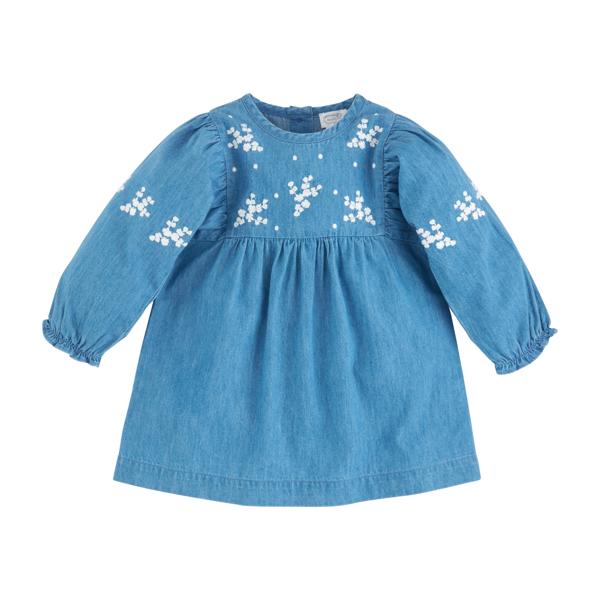 The Blue And White Floral Denim Dress is a stunning piece that will surely catch everyone's attention. This dress is made from high-quality denim fabric, ensuring durability and comfort. The beautiful floral embroidery adds a touch of elegance and femininity to the overall design. Featuring long sleeves with ruffle wrist detail, this dress not only looks stylish but also provides extra warmth during colder days. The ruffle wrist detail adds a playful and charming element to the dress, making it perfect for any occasion. With its versatile blue and white color combination, this dress can be easily paired with any accessories or shoes. Whether it's a casual day out or a special event, this dress is sure to make your little one stand out in the crowd.