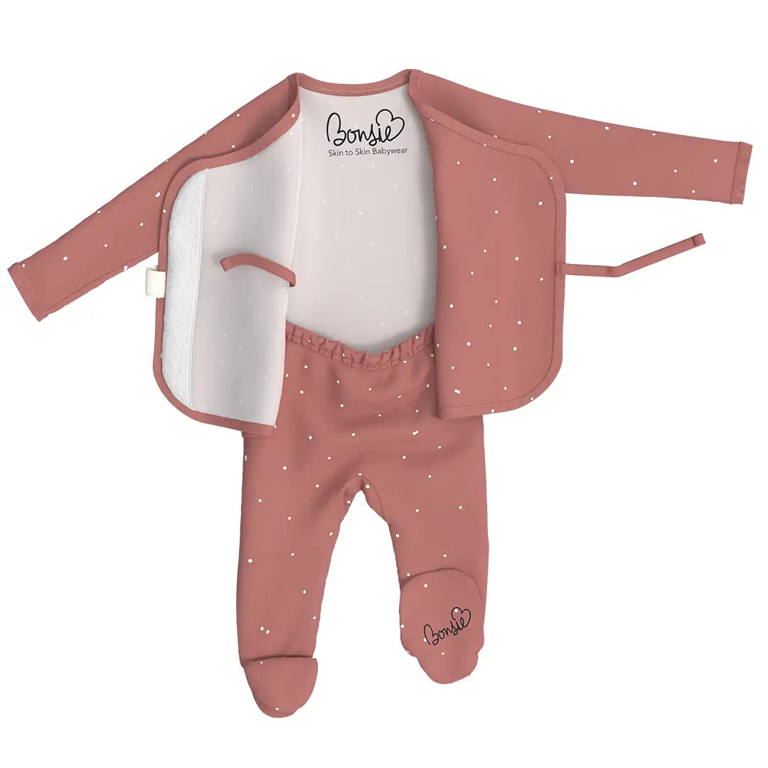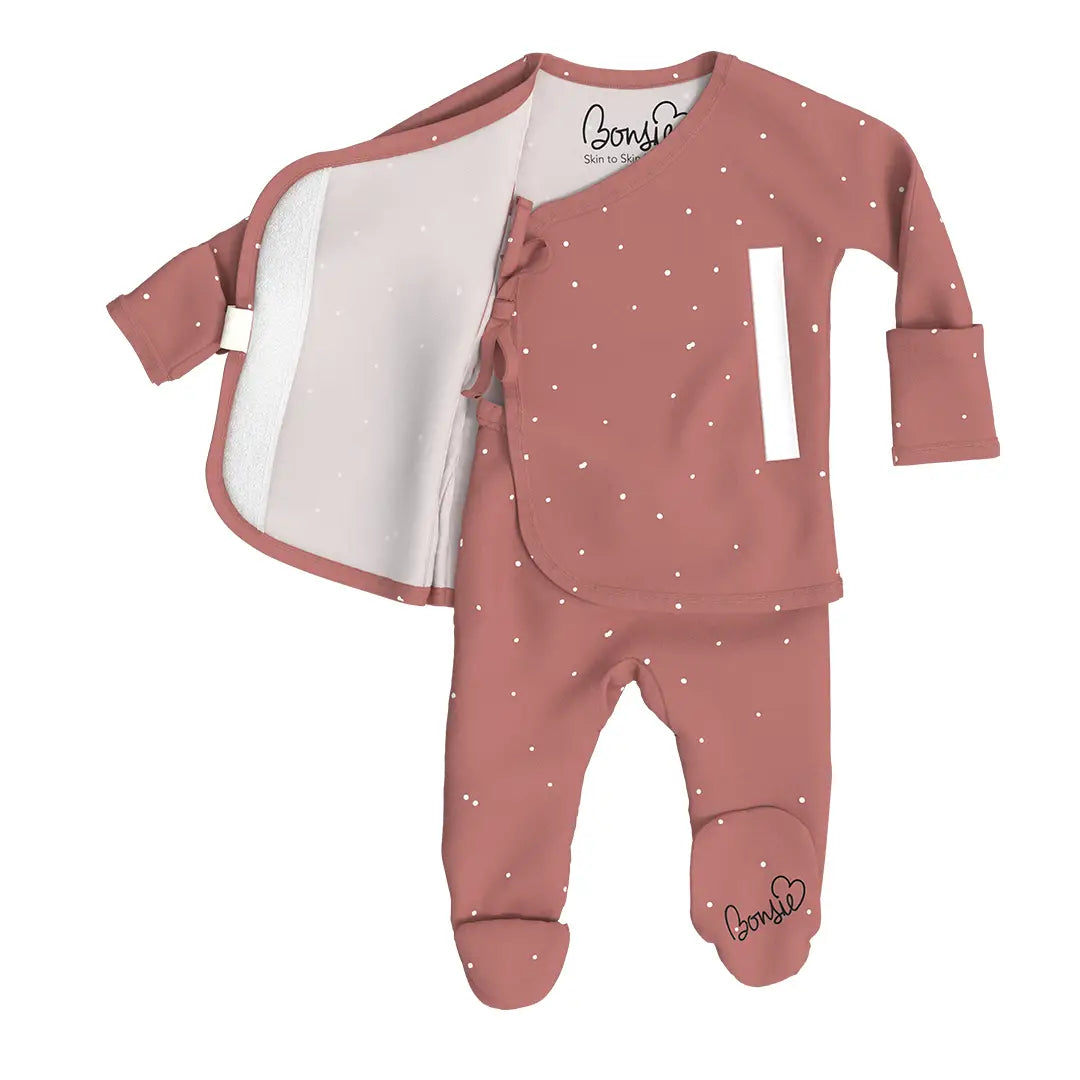 Bonsie's footie is unlike any other on the market! Two double layered flaps are fastened together with ultra soft hook and loop fasteners. Once the two flaps are open, the baby's chest and belly are fully exposed for skin to skin connection. The elastic waistband allows for easy dressing and (as easy as they can get) diaper changes.