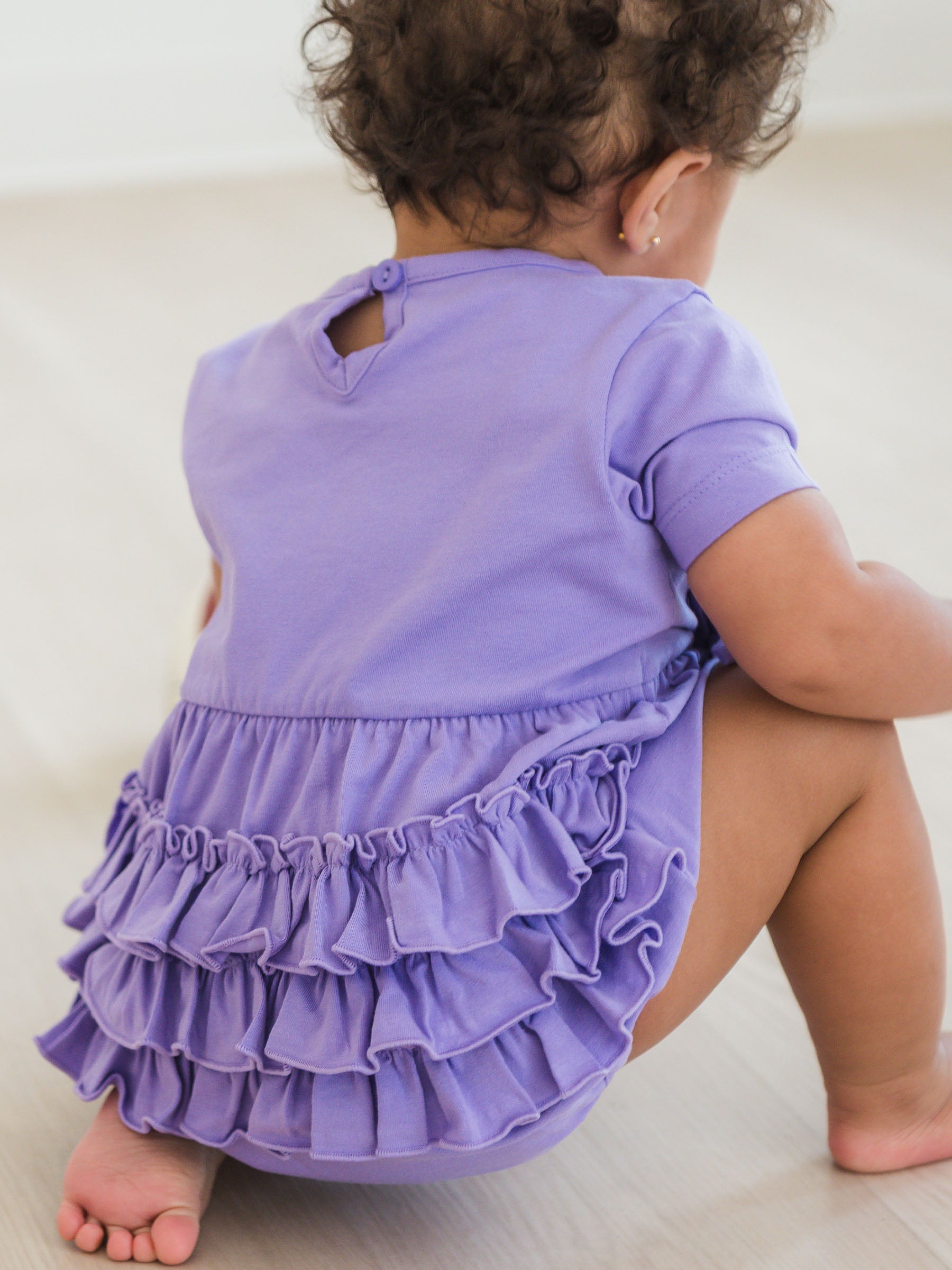 Who can resist this beautiful, deep wisteria purple? Perfect for adding a pop of color into any outfit. This sweet knit bubble romper features tiny bow details at the waist and layers of signature rear ruffles for added cuteness.