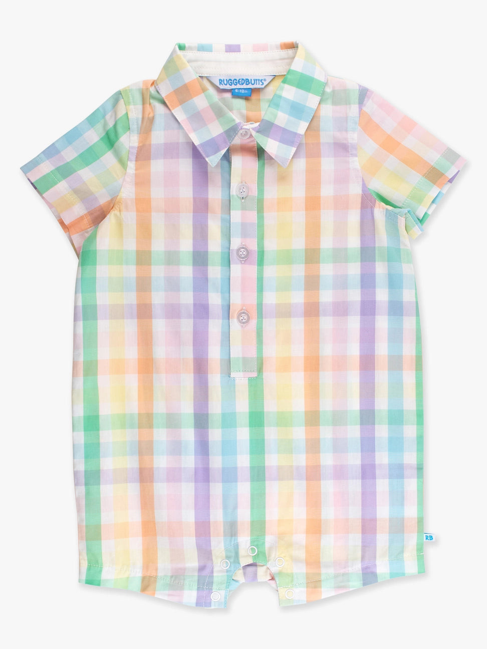 This sweet and stylish baby boy romper is the perfect blend of cuteness and comfort! The button-up design adds a touch of sophistication, while the snaps at the legs allow for easy changing. An adorable and functional pocket adds the finishing touch! A pastel party of pinks, purples, and sunshiney hues - this rainbow gingham plaid is all about soft color and sweet charm. Perfect for bright days, big smiles, and matching moments. Care Instructions: Machine wash cold; only non-chlorine bleach when needed; tumble dry low Fabric Content: 100% Cotton
