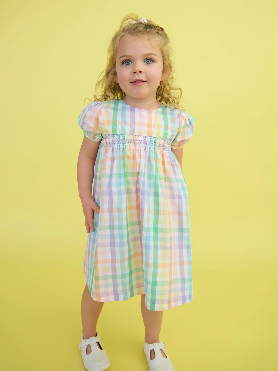 This precious smocked dress is perfect for special occasions and gifting! Sweet puff sleeves and smocking make this dress feel and look luxurious. Perfect for embroidering a name across the chest! A pastel party of pinks, purples, and sunshiney hues - this rainbow gingham plaid is all about soft color and sweet charm. Perfect for bright days, big smiles, and matching moments. Pairs well with Pink, Spring Bud Green, Banana, Lavender, Blue Breeze. Care Instructions: Machine wash warm; bleach when needed; tumble try low; warm iron; dry clean if necessary Fabric Content: 74% Trylene, 23% Viscose, 3% Spandex